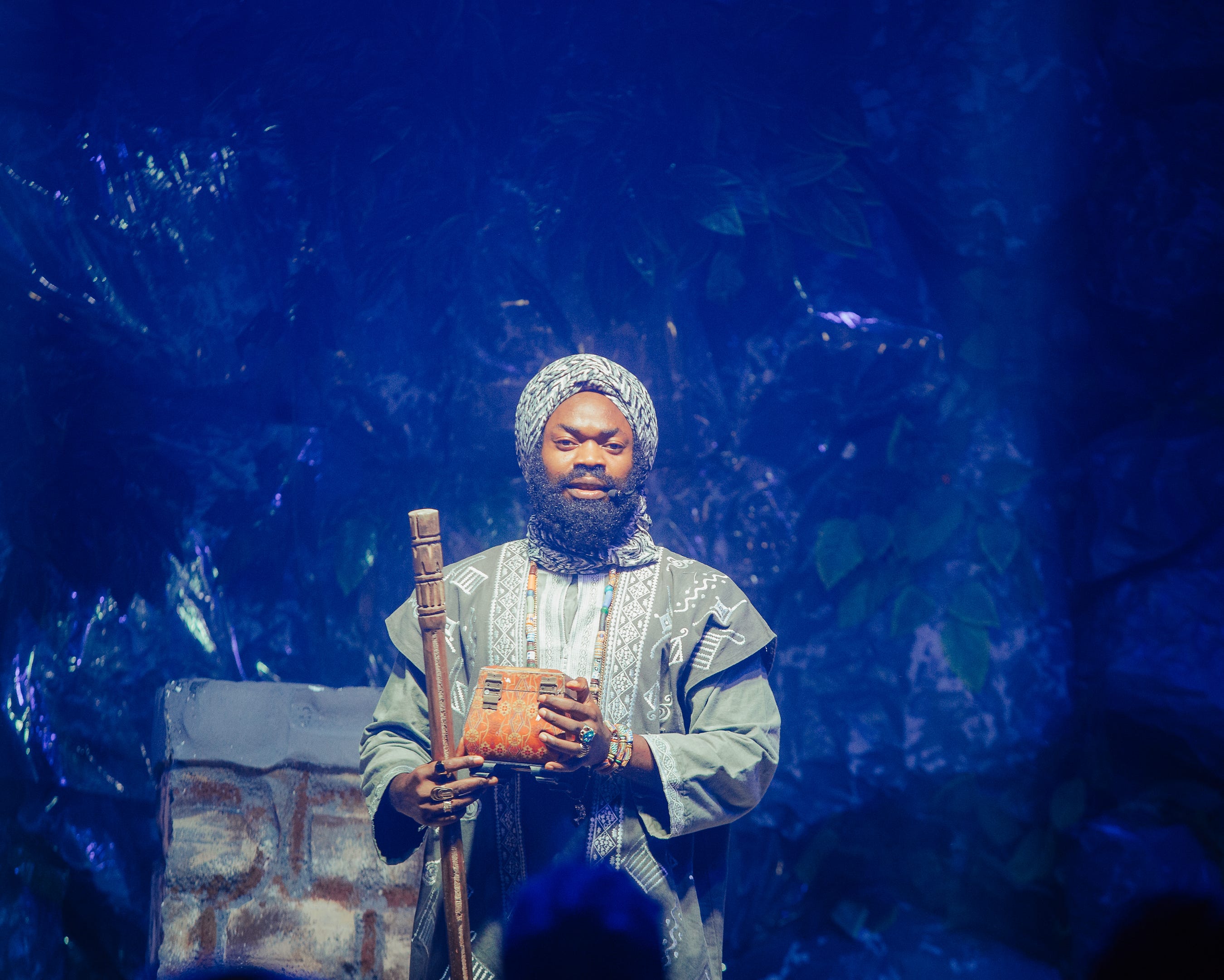 What follows is a live musical performance that collapses the distance between the audience and the stage. It unfolds inside a converted film studio in Ikeja, Lagos, reimagined as a rocky valley, where water cascades down artificial stone walls and wind-blown leaves sweep across the auditorium. The audience does not sit still or stay silent. At key moments, they strike predetermined notes on xylophones to move the story forward. They haggle in a live marketplace, trading with gold pouches purchased with real cash. They pick sides and influence outcomes. By the end of the show, one lucky audience member walks away with an actual treasure.