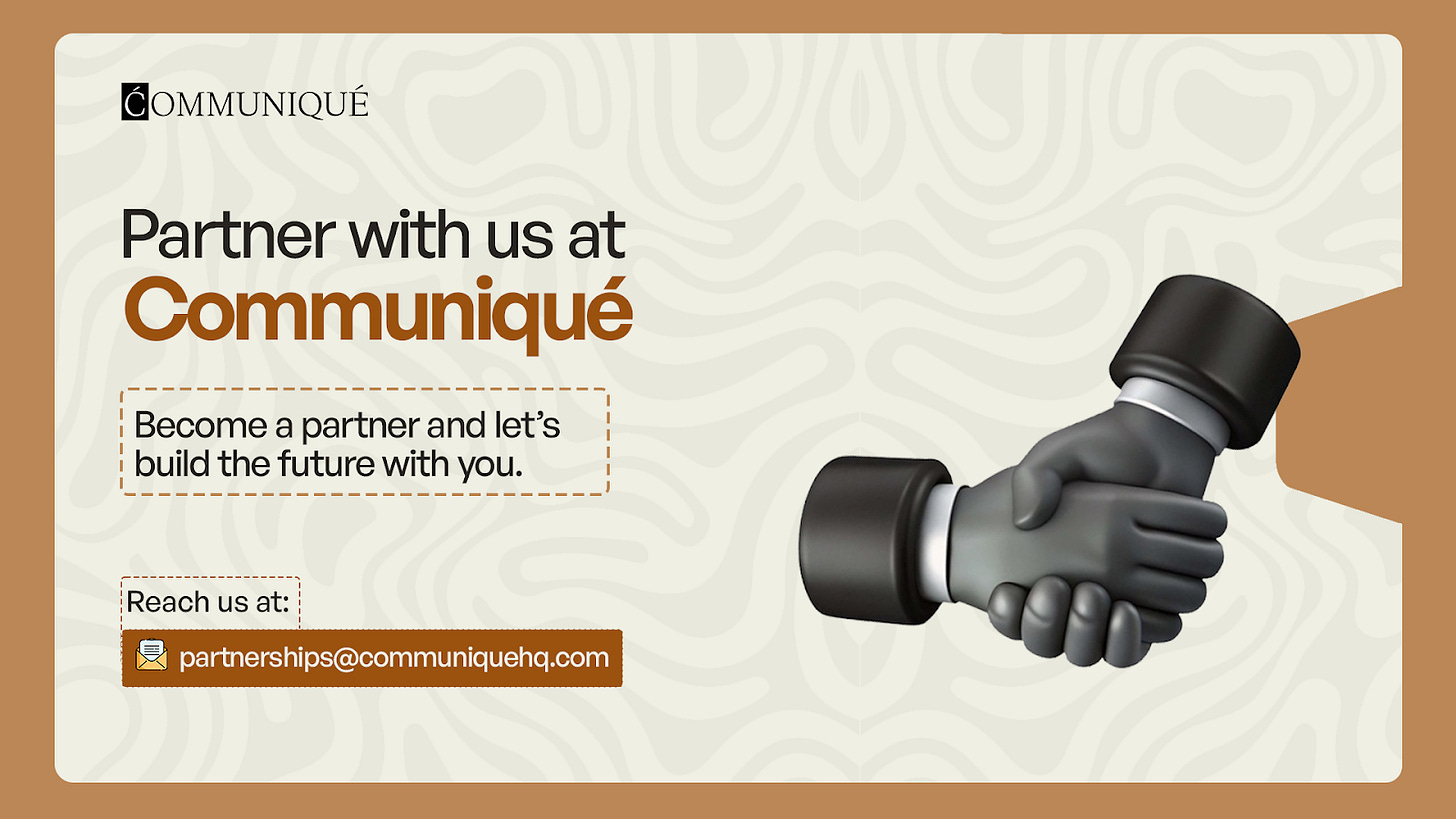 Your brand deserves to be part of the conversations shaping Africa’s future. At Communiqué, we sit at the intersection of culture, business, and ideas—connecting you with the decision-makers, entrepreneurs, investors, and creators driving change across industries.