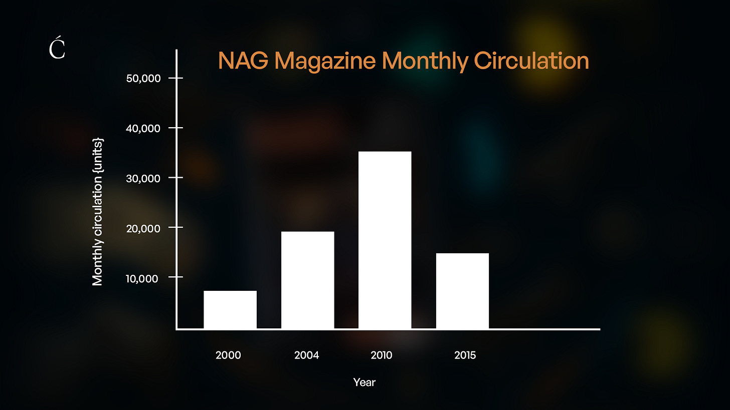But while the expo thrived, NAG’s print business began to falter. The early 2010s were difficult years for media globally, as the rise of the internet disrupted traditional publishing models. For NAG, the challenge was particularly sharp. Its audience, young and tech-savvy gamers, was among the first to migrate online. At its height in the early 2010s, the magazine’s monthly print run reached 35,000, but by 2015 it had declined to 15,000.